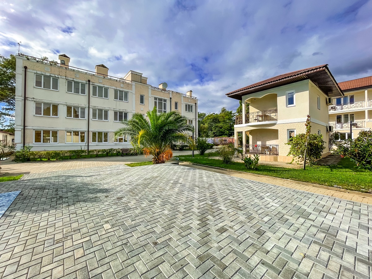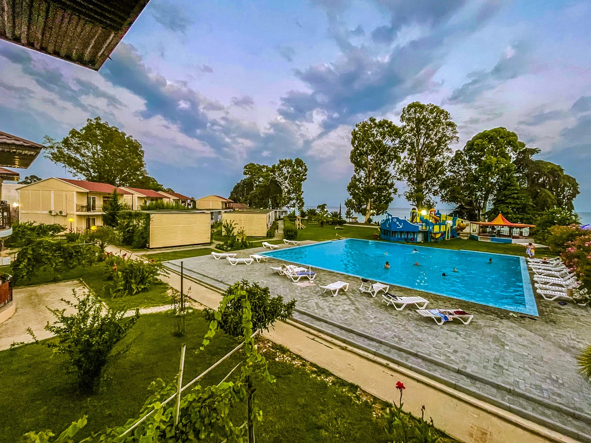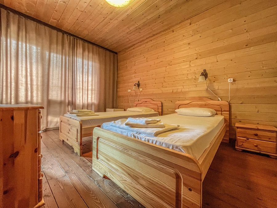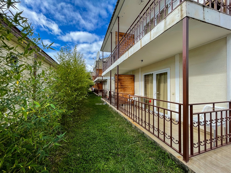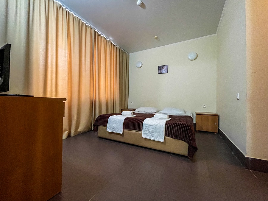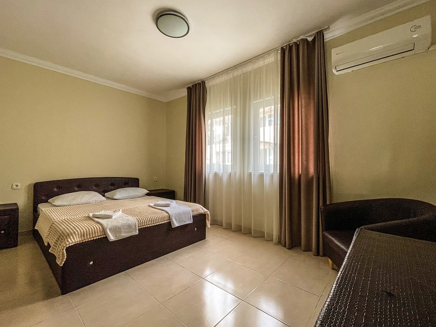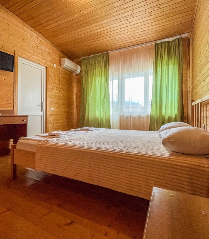 Территория огорожена и имеет площадь 2 гектара. Здесь предусмотрено два корпуса и два коттеджа, где есть 88 комфортабельных номеров. Кроме того, гостей порадует наличие крытого бассейна с целебной сероводородной водой, а также бесплатный Wi-Fi.