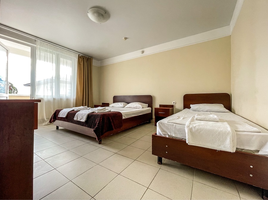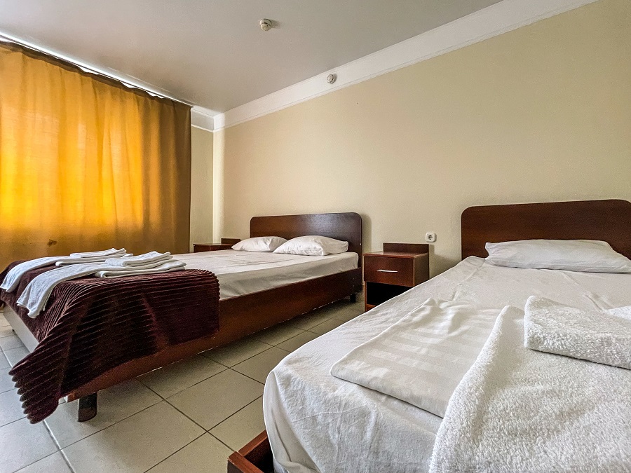 Площадь номера - 20 кв.м. 3 осн. места. Балкон общий. Мебель: вешалка, зеркало, кровати односпальные /одна двуспальная кровать, кровать односпальная, прикроватные тумбочки, шкаф. Оборудование: кондиционер, телевизор, холодильник. Санузел: с душем, туалетные принадлежности. Сервис: Wi-Fi бесплатно, смена полотенец, смена постельного белья, уборка номера.